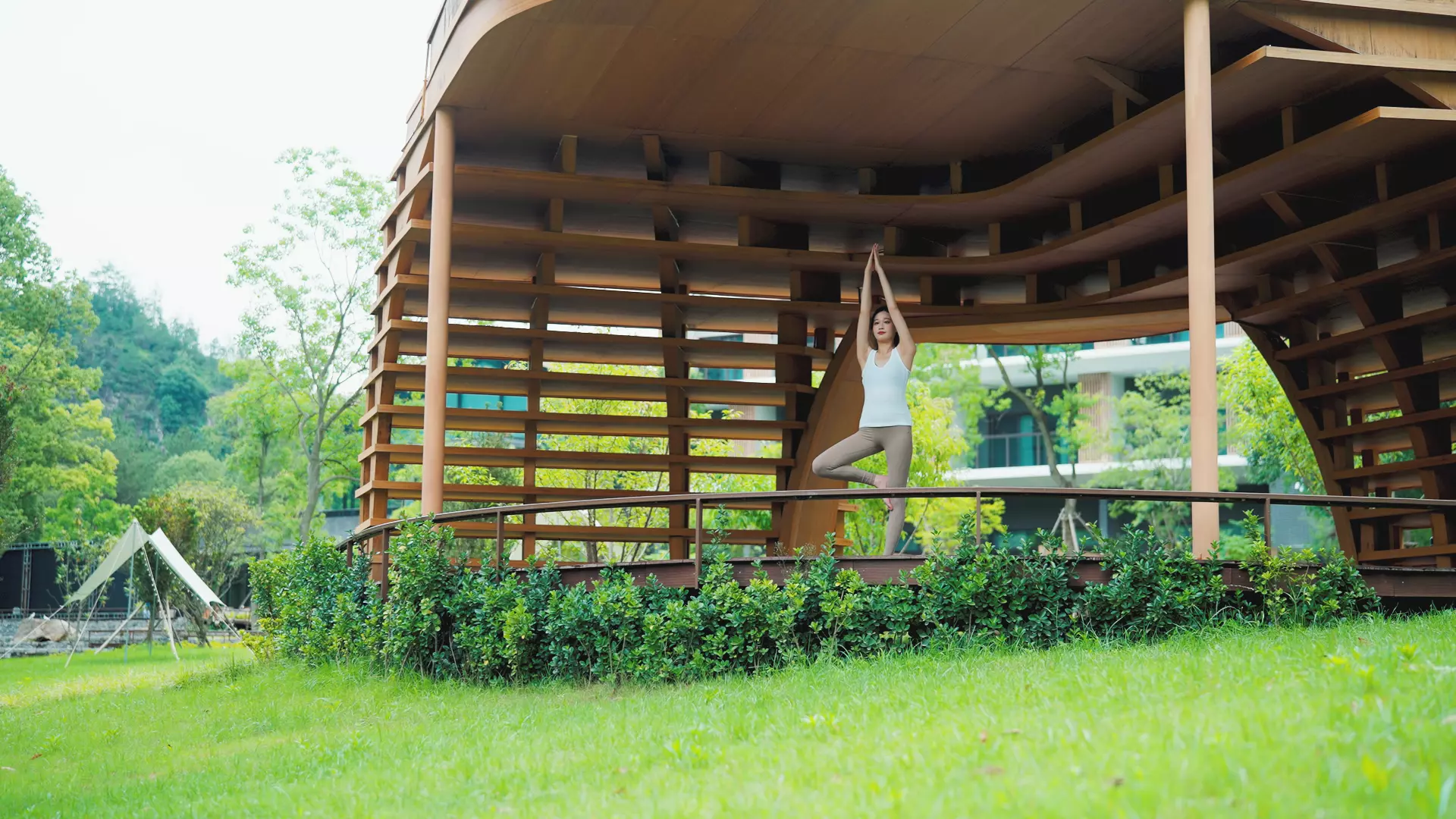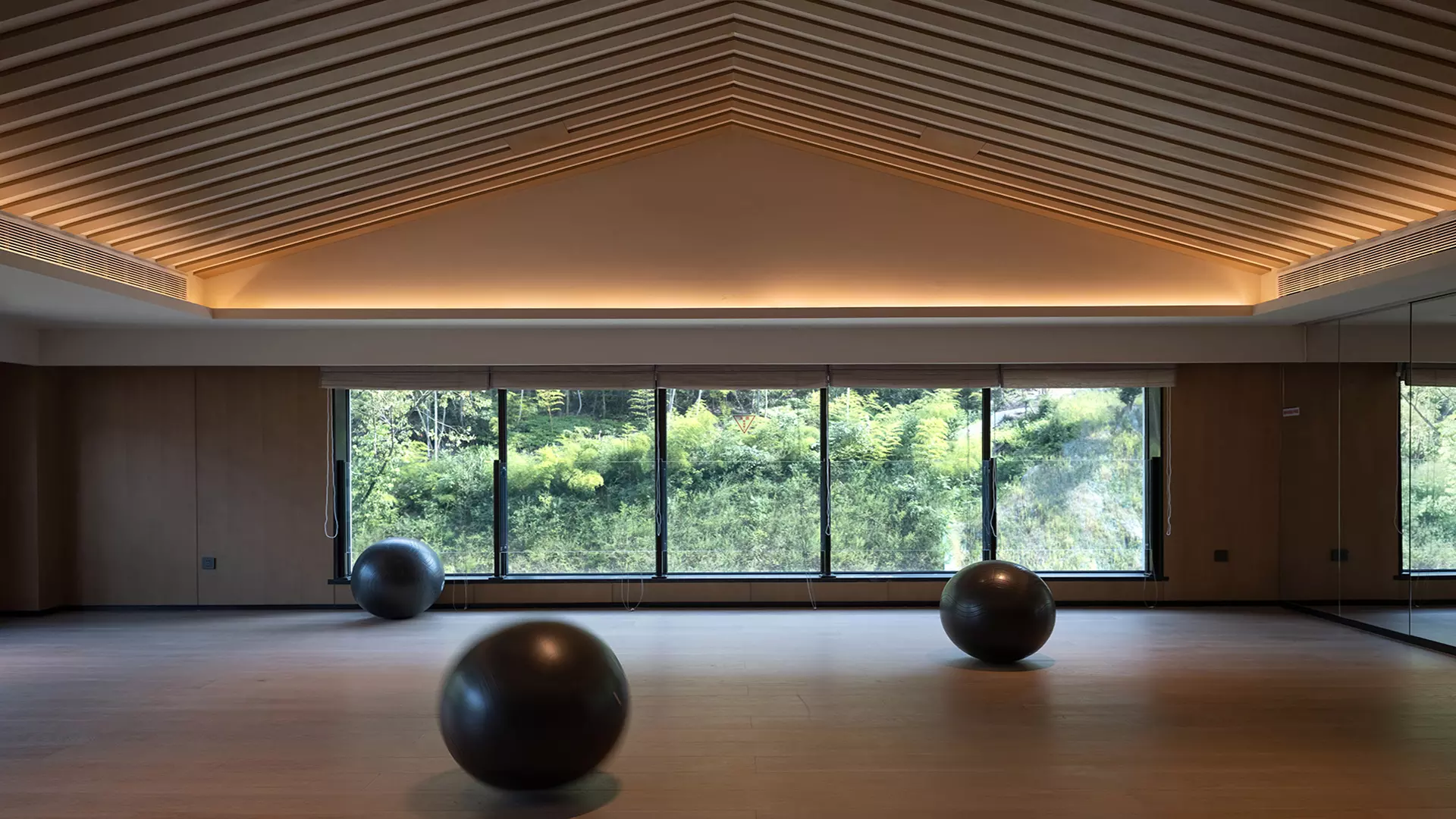 1F户外草坪养修角落,绿茵草坪与木质平台交织。潺潺溪水相伴,草甸铺防滑瑜伽垫,原木辅具依树而置。呼吸间浸染草木清香,随溪声舒展,于自然中疗愈身心。