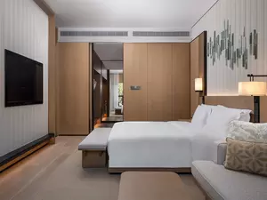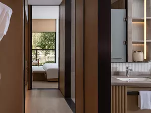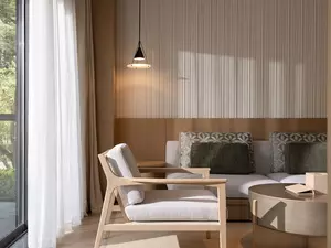 The 'Pillow Water for the Moon' design concept is thoughtfully woven into every detail of this 90-square-metre Xianju hotel suite. A large 1.8*2-metre bed invites a good night's sleep, while well-appointed facilities ensure a comfortable vacation experience. The beautifully landscaped balcony also allows you to enjoy the beauty of nature in a serene, private space.
